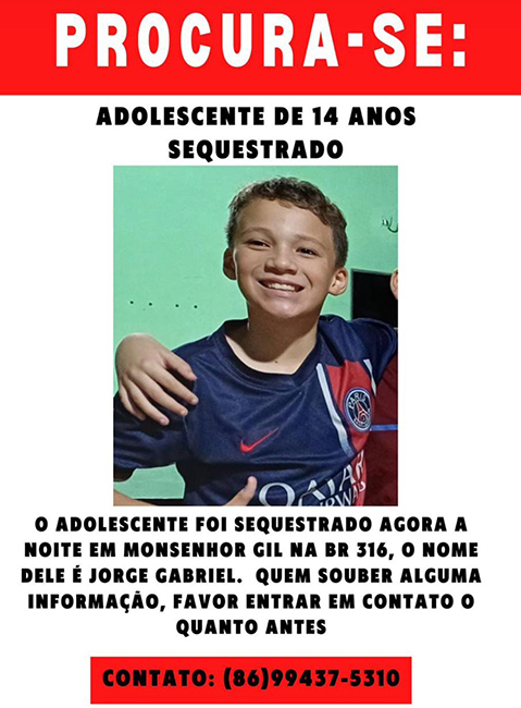 Um adolescente de 13 anos, filho de um empresário, foi sequestrado na noite desta quinta-feira (26), por volta das 21h, no município de Monsenhor Gil, a 59 km de Teresina.
