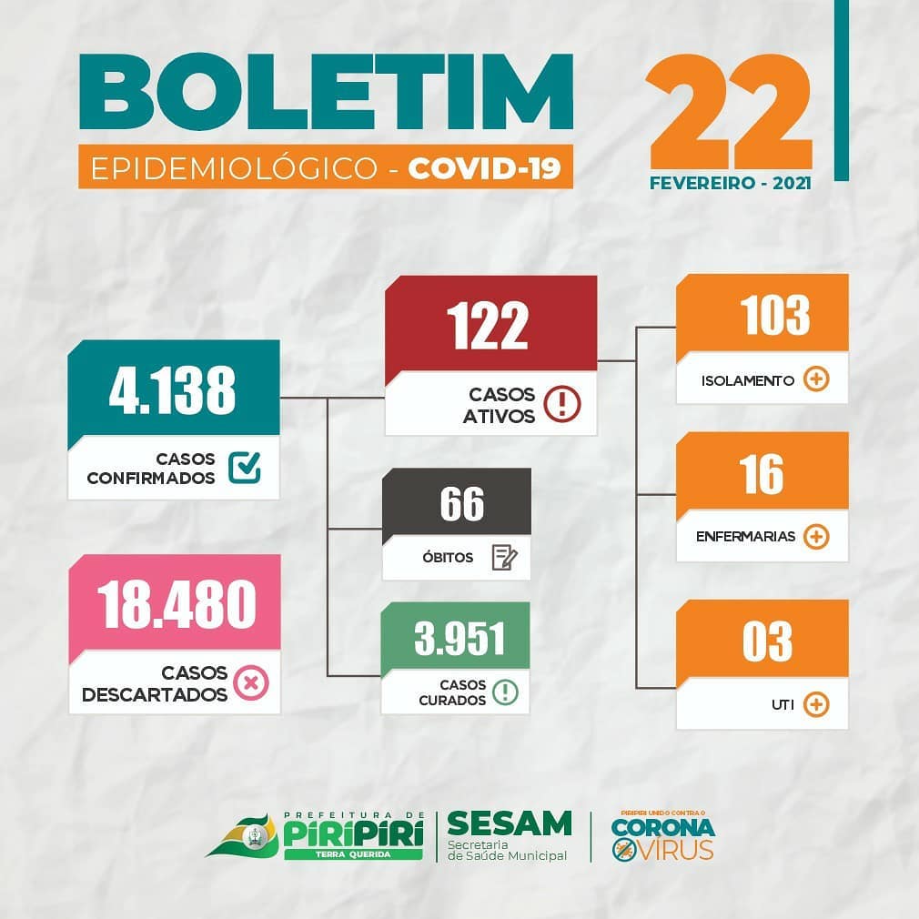 Boletim epidemiológico da Sesam desta segunda-feira (22) registra mais dois óbitos por Covid-19 em Piripiri