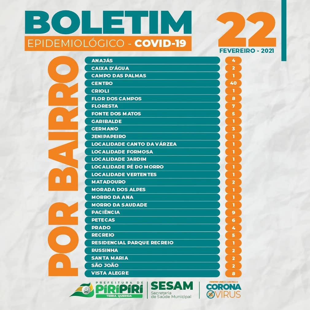 NOTA: Ao tempo que informamos, lamentamos profundamente mais 02(dois) óbitos no boletim do Município, trata- se de uma jovem de 28 anos de idade sem comorbidades, e uma senhora de 86 anos com comorbidades.