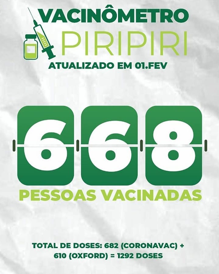 Boletim Vacinômetro: Em Piripiri 668 profissionais de saúde já foram vacinados contra a COVID-19 1 de fevereiro de 2021 DESTAQUES De acordo com o boletim Vacinômetro divulgada pela Sesam, até este dia 01/Fevereiro já foram vacinados 668 profissionais de saúde contra a COVID-19 em Piripiri.