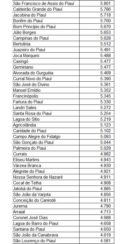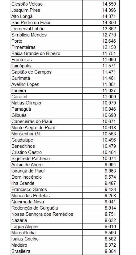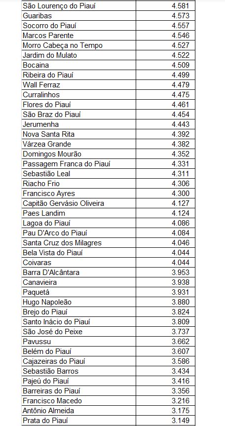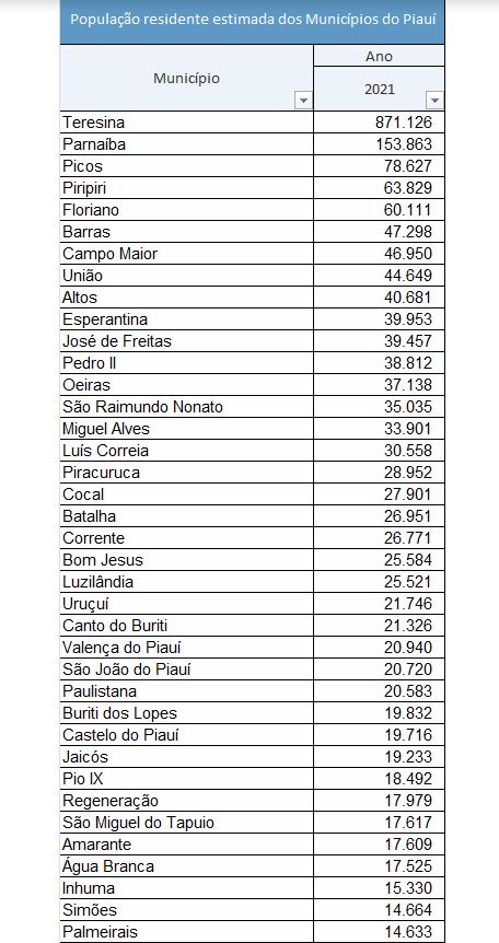 Vale destacar que em 2020, Piripiri tinha uma população estimada em 63.742 habitantes e agora em 2021 totaliza 63.829, portanto um aumento de 87 pessoas na cidade.