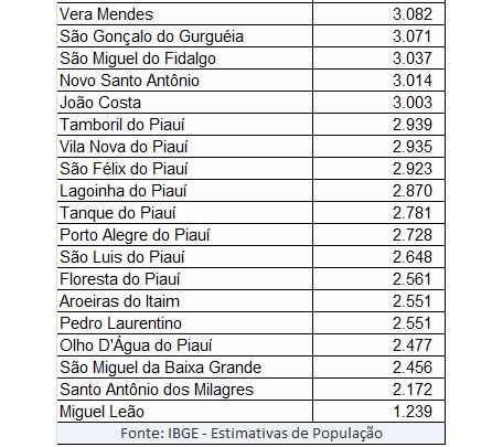 No Piauí, predominam as cidades com até 10 mil moradores. São 160 municípios nessa condição, o que representa 71,4% do total de municípios do estado. Nesses locais, vivem 26,2% dos habitantes do Piauí, o equivalente a 861.329 pessoas.