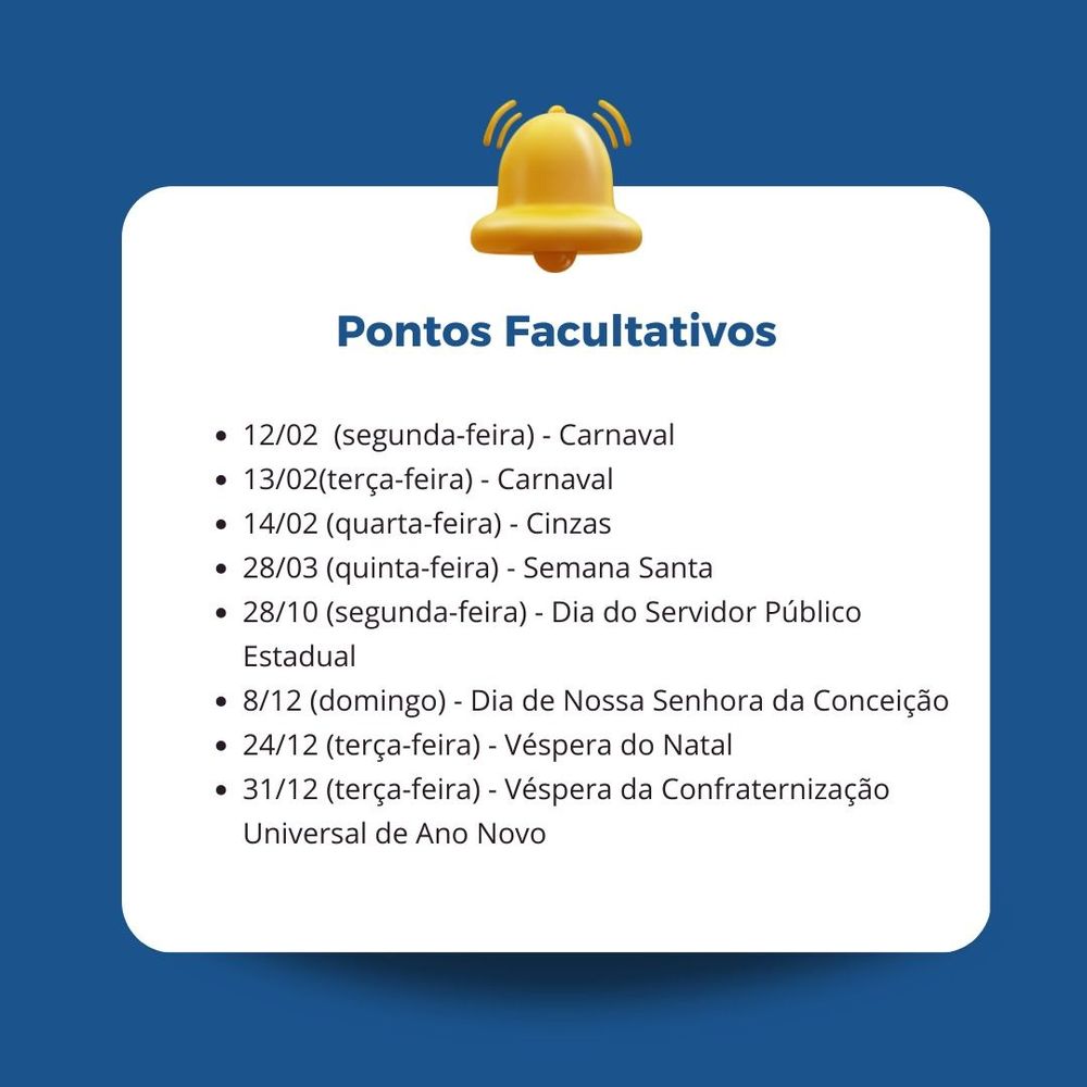 Em 2024, serão oito datas com ponto facultativo e 11 feriados, com destaque para o novo feriado de 20 de novembro, Dia Nacional da Consciência Negra. A legislação obedece à Lei Federal e prevê o funcionamento dos serviços considerados essenciais.