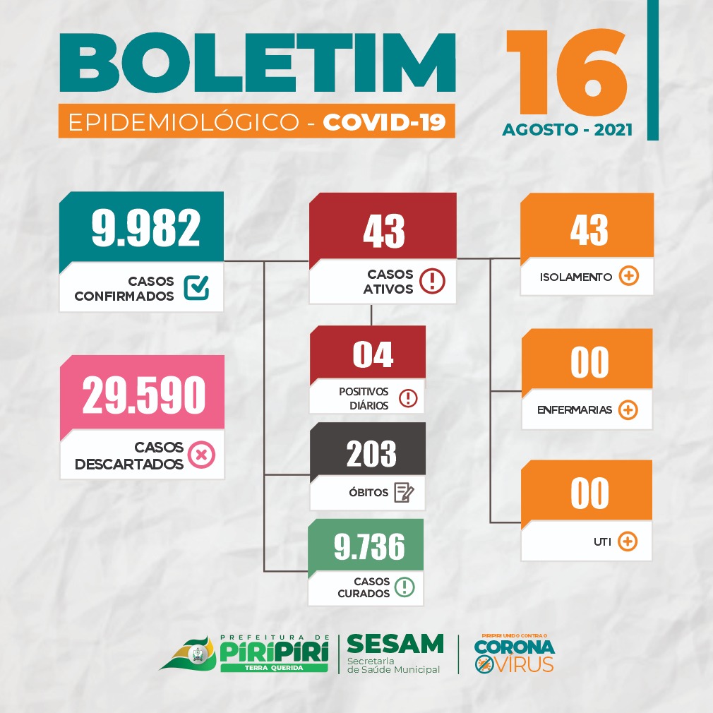 É com muita satisfação que informamos em nosso boletim epidemiológico que o Hospital Regional Chagas Rodrigues se encontra-se sem nenhum paciente do município de Piripiri internado por Covid-19. Totalizando 6 dias sem internações de munícipes! Os cuidados necessários devem continuar para prevenção da COVID-19.