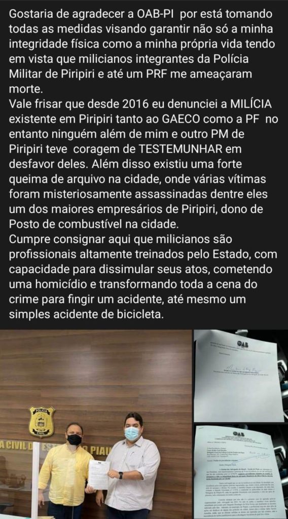 De acordo com o Presidente da CDPA, Marcus Nogueira, ao tomar conhecimento do ocorrido, a OAB Piauí entrou em contato com o Delegado Geral, Luccy Keiko, para pedir o reforço à segurança de Humberto Chaves. “O Advogado foi vítima de agressões físicas e verbais por parte de um Policial Rodoviário Federal e de um Policial Militar, e agora está sendo perseguido por conta de sua atuação profissional. Por isso, solicitamos este reforço ao Delegado, a fim de garantir a segurança do Advogado Humberto da Silva Chaves no município”, enfatizou o Presidente da CDPA.