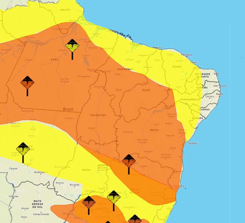 No restante do mapa o alerta laranja está sob 135 municípios, segundo o Instituto. Algumas cidades do Piauí estão sob os dois avisos como é o caso de Angical, Palmeirais e Novo Oriente. A previsão é de chuva entre 30 e 60 milímetros por hora ou 50 e 100 milímetros por dia, ventos intensos de 60 a 100 km/h.