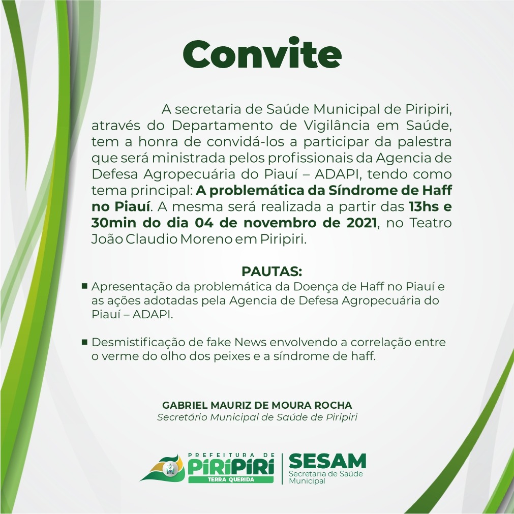 Diante da problemática da Doença de Haff, popularmente conhecida como “Doença da Urina Preta”, Prefeitura de Piripiri, através da Sesam (Secretaria de Saúde do Município de Piripiri) por meio do Departamento de Vigilância em Saúde vem convidar a toda população piripiriense e região a acompanhar a palestra que será ministrada pelos profissionais médicos veterinários da Agência de Defesa Agropecuária do Piauí (ADAPI) de Teresina.
