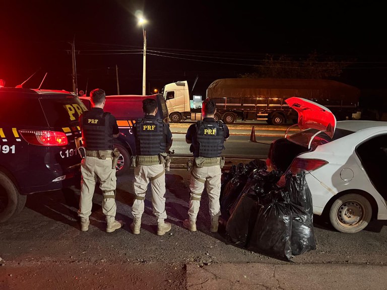 Ao iniciar a fiscalização, os agentes perceberam forte odor característico de maconha vindo do interior do veículo. Diante da suspeita, foi realizada uma busca minuciosa, que resultou na localização de 13 sacos de cor preta contendo a substância ilícita, distribuídos entre o porta-malas e o banco traseiro do carro.