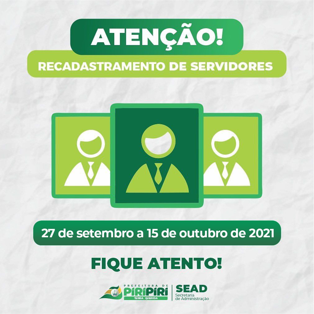 Os servidores da Prefeitura Municipal de Piripiri a partir de segunda, dia 27 de setembro de 2021 tem que fazer seu recadastramento. Eles estão divididos da seguinte forma: os funcionários da Seduc- Secretaria de Educação de Piripiri irão fazer no auditório da Casa dos Conselhos. O período será de 27 de setembro a 22 de outubro, de acordo com a letra inicial do nome.