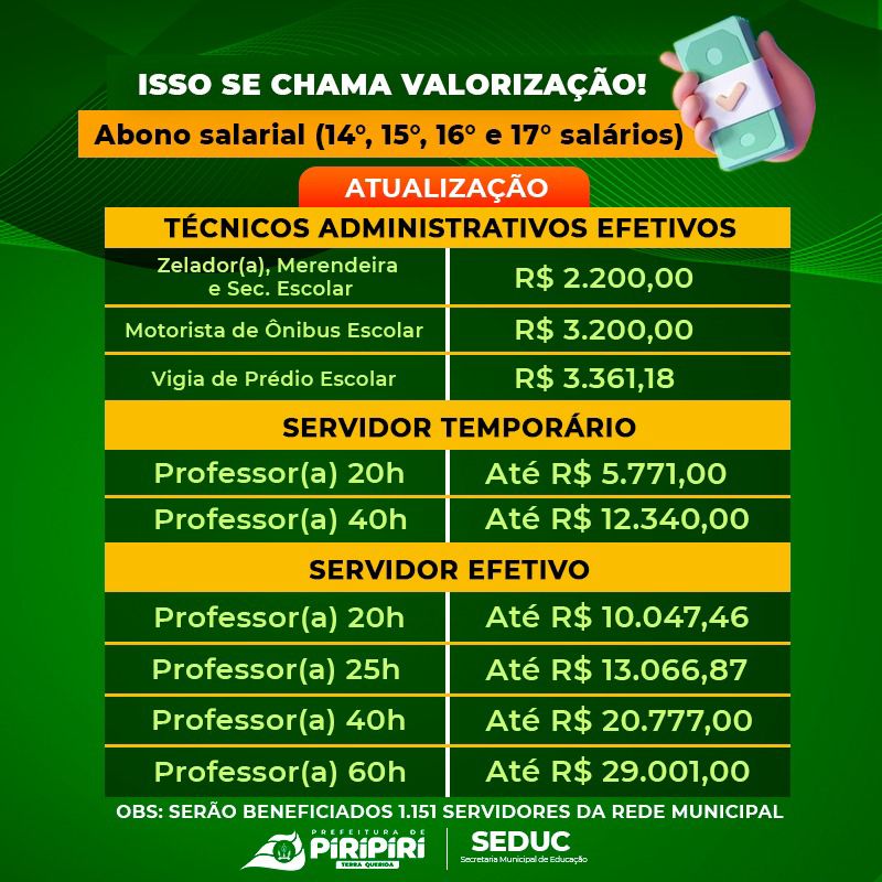 Abono dos trabalhadores da Educação de Piripiri vai injetar mais de R$ 11,6 milhões na economia