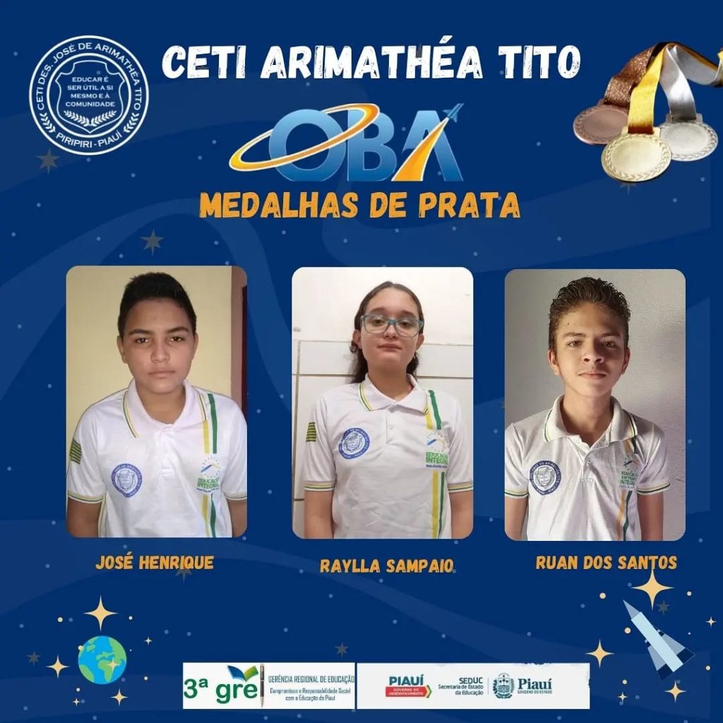 A 3° Gerência Regional de Educação, através do seu gerente ,Regiomar Meireles, e toda sua equipe, parabeniza os estudantes do CETI José Arimathéa Tito, de Piripiri, pelo destaque nas Olímpiadas Brasileira de Astronomia. A escola ficou com total de 17 medalhas olímpicas. Além disso, dois alunos do 9° ano foram convidados para participar da fase online da seletiva, para a Olimpíada Internacional de Astronomia 2022. Os alunos: Heder Pereira R. Silva e Maria Eduarda dos S. Emiliano podem representar o Brasil nesta competição do saber.