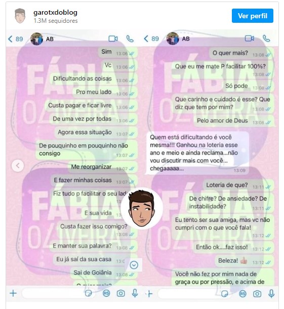 E ele responde, direto: “Quem está dificultando é você mesma!!! Ganhou na loteria esse ano e meio e ainda reclama… Não vou discutir mais com você, chegaaa”. Por sua vez, ela rebate: “Loteria de quê? De chifre? De ansiedade? De instabilidade? Eu tento ser sua amiga, mas você não cumpre com o que você fala”.