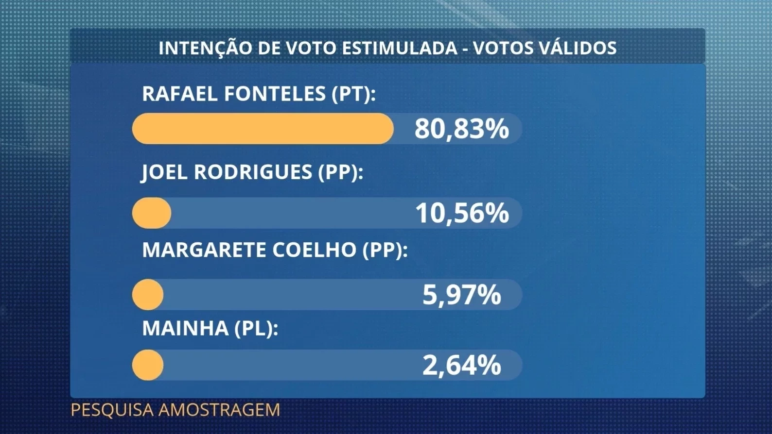 O Instituto Amostragem quis saber também como os eleitores votariam para governador na próxima eleição de 2026. Segundo a pesquisa, Rafael Fonteles (PT) teria 80,83% dos votos válidos, contra 10,56% de Joel Rodrigues (Progressistas), 5,97% da ex-deputada federal Margarete Coelho (Progressistas) e 2,64% do ex-deputado federal Mainha (PL).