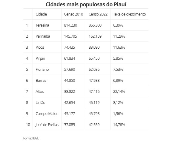 O Instituto Brasileiro de Geografia e Estatística (IBGE) informou, na quarta-feira (28), as 10 cidades mais populosas do Piauí, segundo o Censo Demográfico 2022. Teresina, a capital, tem a maior população do estado e é a 19ª cidade mais populosa do Brasil, com 866 mil habitantes.