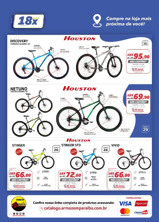 Nessa semana todo setor de bicicleta do Paraíba está em promoção. Na linha aro 29 você pode parcelar em até 18x. Não perca tempo e venha pedalar com uma Bike Houston.