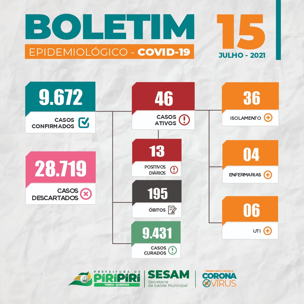 Boletim epidemiológico da Covid-19 emitido pela Secretaria de Saúde Municipal de Piripiri, nesta quinta-feira (15)