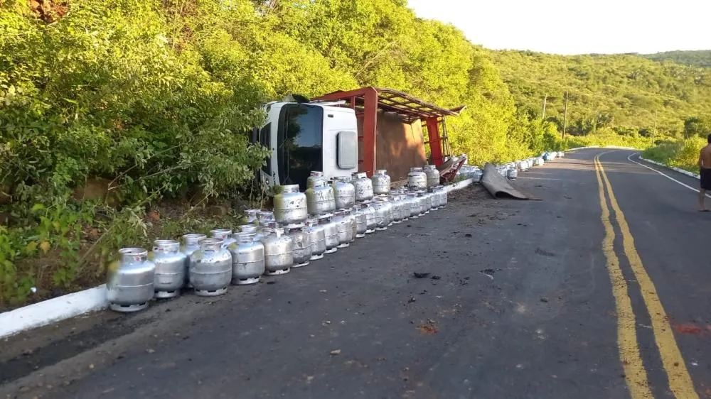 Um caminhão carregado com botijões de gás tombou na tarde deste sábado (28) em um trecho da rodovia entre os municípios de Lagoa de São Francisco e Piripiri.