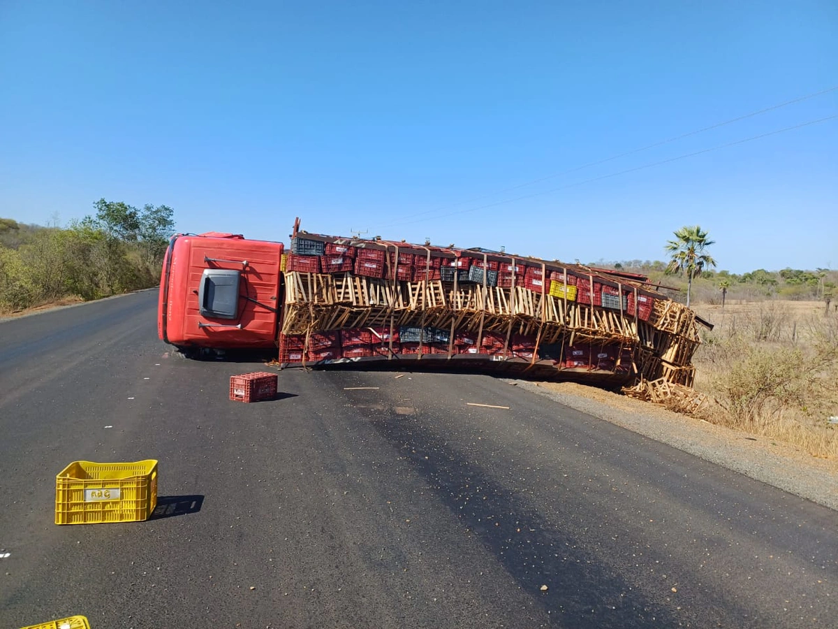 De acordo com a Polícia Rodoviária Federal (PRF), uma carreta bateu na traseira de um caminhão, que acabou tombando. A dinâmica do acidente ainda está em análise, mas a PRF presume que o ocorrido se deu por uma manobra de mudança de faixa.