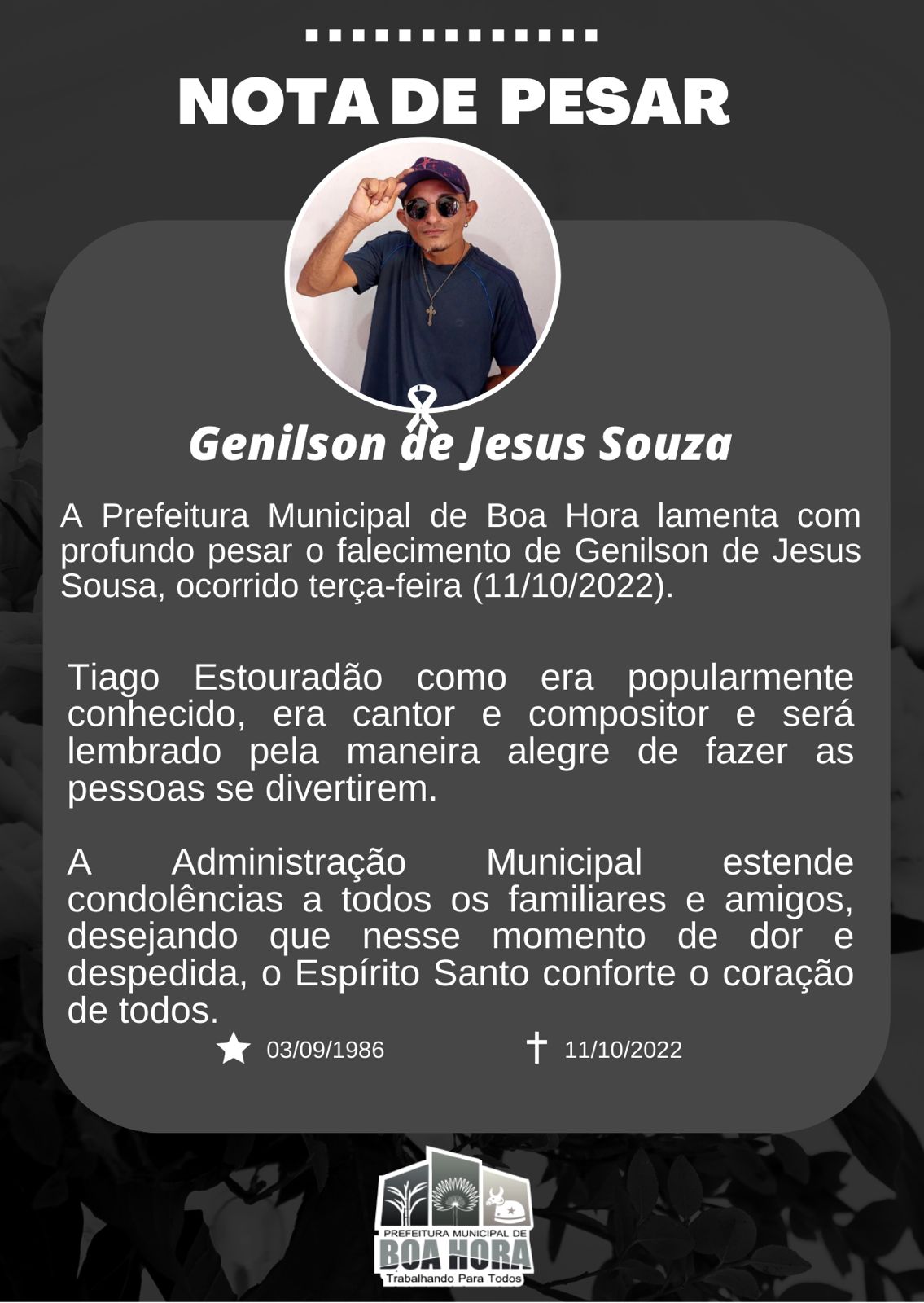 Através de nota, a Prefeitura de Boa Hora lamentou a morte do artista. RapaduraNews