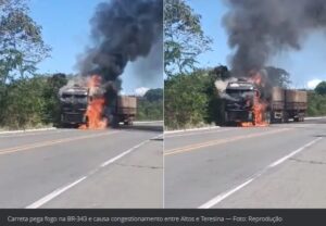 Carreta pega fogo na BR-343 e causa congestionamento entre Altos e Teresina