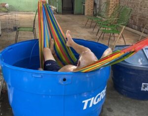 Para fugir do calorão, idoso coloca rede dentro de caixa d’água em alusão a praias de Jericoacoara e viraliza