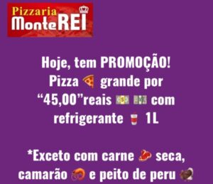 Aproveite esta promoção SÓ HOJE na Pizzaria Monte Rei! Pizza grande + refri de 1L por apenas 45 reais!