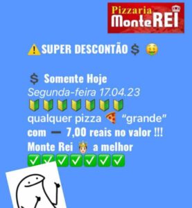 Hoje segunda-feira tem SUPER DESCONTÃO em qualquer pizza grande na Pizzaria Monte Rei!! Aproveite!