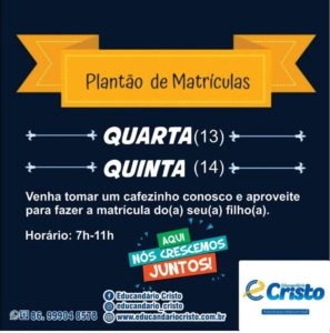 Educandário Cristo informa: matrículas gratuitas para o Infantil II e Infantil III Faça acontecer!