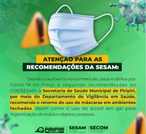 Secretaria de Saúde Municipal de Piripiri recomenda o retorno do uso de máscaras em ambientes fechados