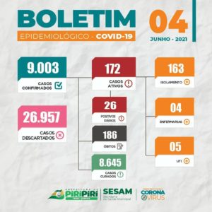Piripiri chegou ao total de 186 óbitos por Covid-19, de acordo com boletim da Sesam dos últimos dias
