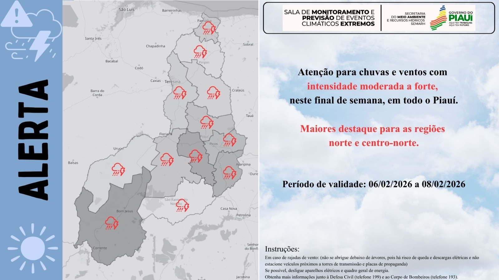 De acordo com a meteorologista Sônia Feitosa, da Sala de Monitoramento e Previsão de Eventos Climáticos Extremos da Secretaria de Meio Ambiente e Recursos Hídricos (Semarh), o cenário climático é considerado preocupante e exige cautela. “A previsão que se estende de hoje até domingo é de chuvas mais volumosas em toda a extensão territorial do estado, acompanhadas de ventos mais fortes e descargas atmosféricas em alguns municípios”, explica.