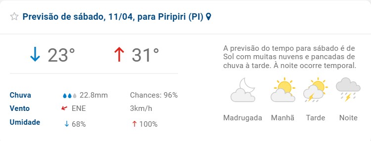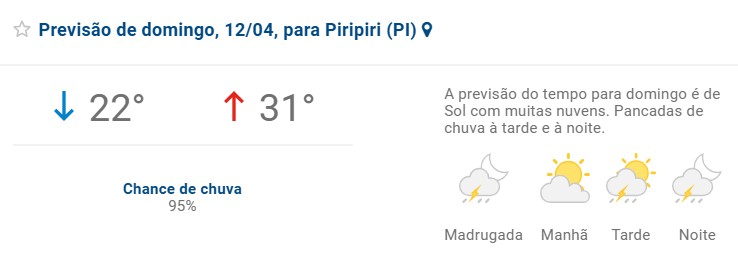 O Piauí deve ter um fim de semana de tempo instável, com previsão de chuvas em grande parte do estado. Entre 10 e 16 de abril, são esperadas precipitações em todas as regiões, com maior volume no Norte e no Centro-Norte, de acordo com a Secretaria de Meio Ambiente e Recursos Hídricos (Semarh).