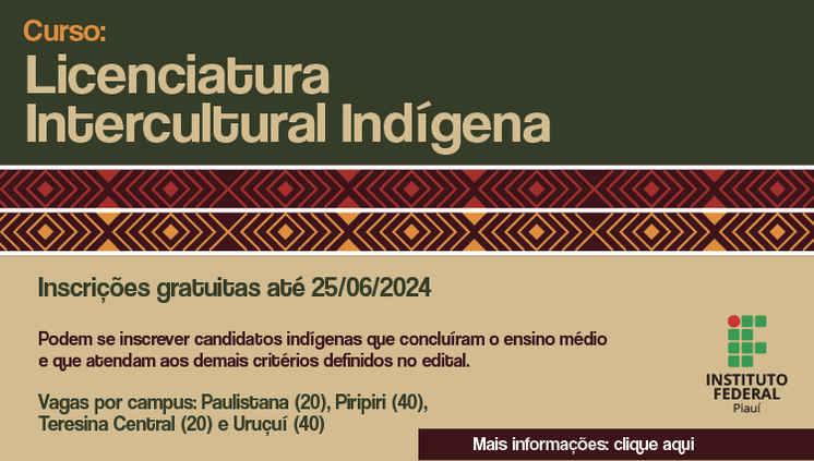 O Instituto Federal do Piauí (IFPI) está com inscrições abertas para o preenchimento de 120 vagas no Curso Superior de Licenciatura Intercultural Indígena, ofertadas para o 2º semestre de 2024, nos campi Piripiri, Paulistana, Teresina Central e Uruçuí.