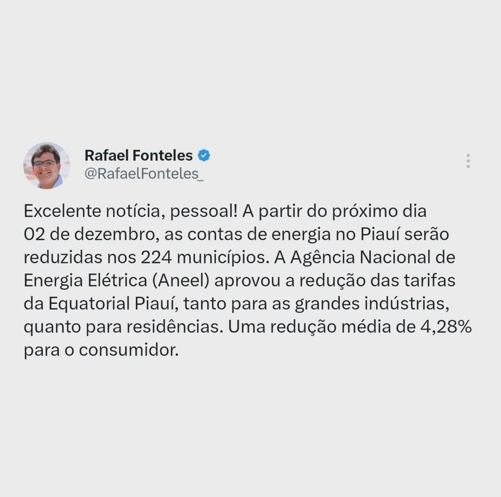 O governador Rafael Fonteles celebrou a medida em suas redes sociais. “Excelente notícia! A partir de 2 de dezembro, as contas de energia no Piauí serão reduzidas em todos os 224 municípios. A Aneel aprovou a redução das tarifas da Equatorial Piauí, beneficiando tanto as grandes indústrias quanto os consumidores residenciais, com uma redução média de 4,28% para todos”, afirmou.