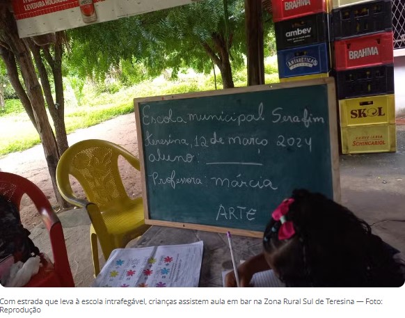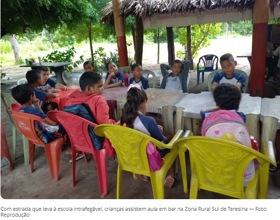 Estudantes da Escola Municipal Serafim, localizada no Povoado Cebola, Zona Rural Sul de Teresina, tiveram que assistir a aulas em um bar da região. O motivo? a estrada que leva à unidade escolar está intrafegável devido à lama.