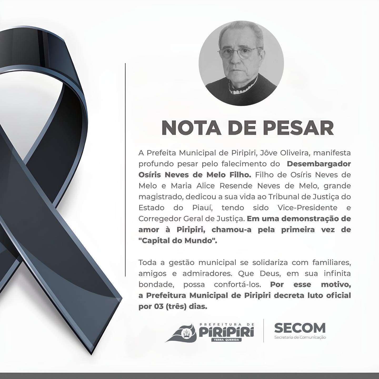 Neste momento de dor, a Prefeita de Piripiri, Jôve Oliveira, expressa as mais sinceras condolências aos amigos e familiares e agradece pelos serviços prestados pelo desembargador Osíris Neves de Melo Filho, o filho ilustre de Piripiri.
