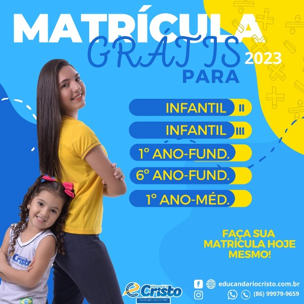 Educandário Cristo – A escola que cresce com você! Informações: Rua Major Antônio Albino, nº 523 – Centro, Piripiri – PI, (86) 99979-9659 ( TIM / WhatsApp).