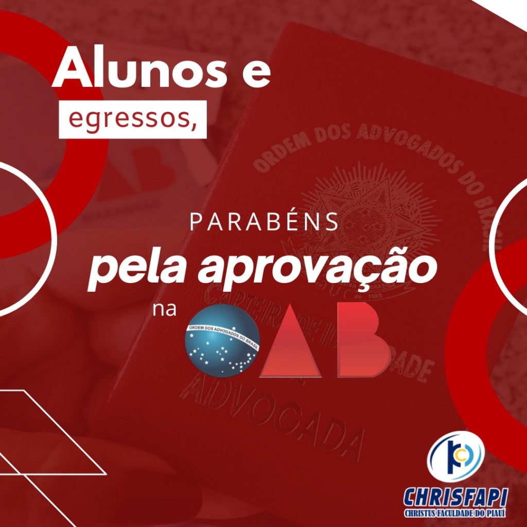É com muita alegria que a Faculdade Chrisfapi congratula os discentes e egressos aprovados no 34º Exame de Ordem Unificado. A aprovação no Exame é requisito necessário para a inscrição nos quadros da OAB como advogado, e mais uma vez o corpo discente da instituição destaca-se através de um número muito grande de aprovações na OAB.