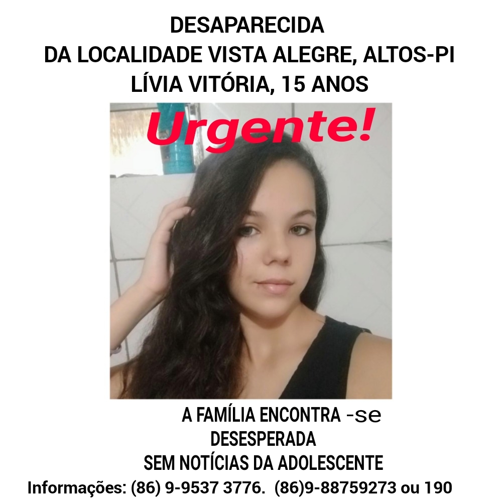 Uma jovem identificada como Lívia Vitória, 15 anos, está desaparecida deste a madrugada do domingo (16) para segunda (17), da localidade Vista Alegre, situada entre as cidades de Altos e Teresina .