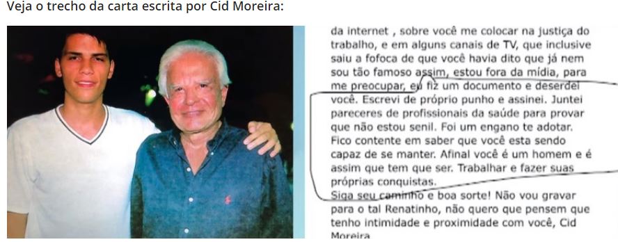 “Você continua sendo meu filho adotivo porque não consegui reverter a adoção (…). Eu fiz um documento e deserdei você. Escrevi de próprio punho e assinei. Juntei pareceres de profissionais da saúde para provar que não estou senil. Foi um engano te adotar. Fico feliz em saber que você está sendo capaz de se manter”, escreveu Cid num trecho do texto.