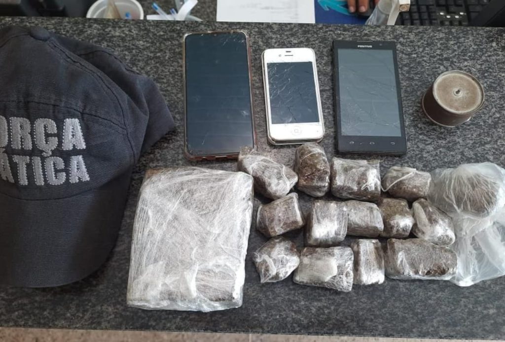 A ação policial se deu após informações recebidas através do COPOM sobre a possível localização de um celular roubado, a GU compareceu ao local e localizou um celular com a suspeita, em seguida, confirmando tratar-se de celular com registro roubo/furto; ainda do lado externo da residência, a GU visualizou mais dois celulares e um material sobre um rack, aparentando ser droga; os policiais verificaram tratar-se de uma porção aparentemente droga; que em seguida foi localizado o restante do ilícito.