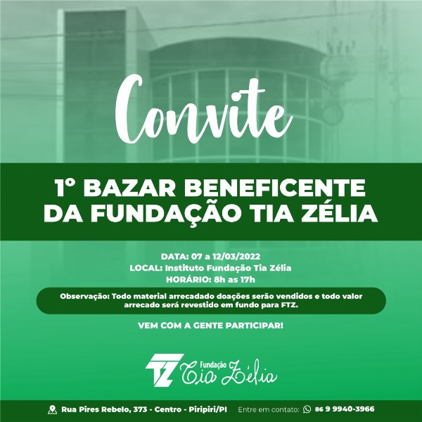 A Fundação Tia Zélia em sua missão de promover cidadania está organizando o Primeiro Bazar Solidário de 07 a 12 de março de 2022.