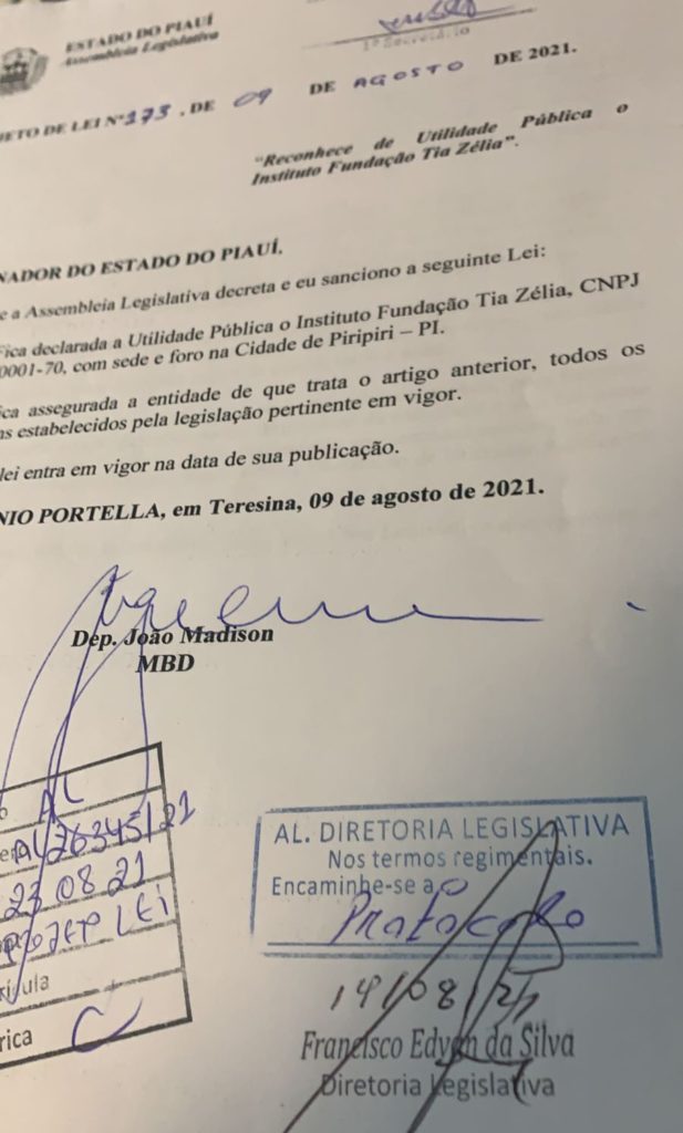 A Fundação Tia Zélia recentemente teve a propositura de lei que a torna uma entidade de utilidade pública no âmbito estadual e nacional apresentado e aprovado na Assembleia Legislativa do Piauí (ALEPI), dando início assim ao procedimento que a torna apta a receber recursos estaduais, emendas parlamentares e parcerias governamentais, podendo assim aumentar suas ações sociais e diversificar cada vez mais suas atividades gerando sua auto sustentabilidade, possibilitando e gerando cada vez mais cidadania e esperança para a população da cidade de Piripiri e região. “O pontapé inicial é uma propositura do Deputado João Madison que gentilmente demonstra esse carinho por nossa cidade de Piripiri”, ressaltou Leonardo.Com sua habilitação aprovada em lei, a FTZ já se prepara para a execução do PROAJA,  Programa de Alfabetização de Jovens e Adultos no Piauí, onde cada aluno matriculado e alfabetizado receberá uma bolsa de 400 reais da instituição durante os 4 meses do curso. Em breve as matrículas estarão abertas.