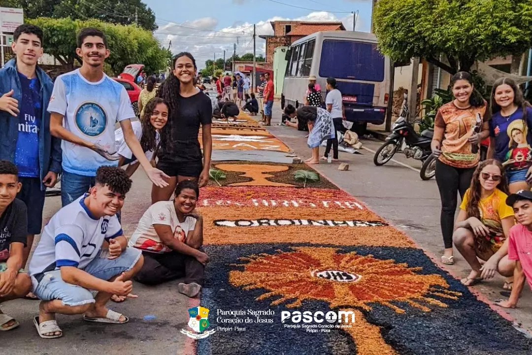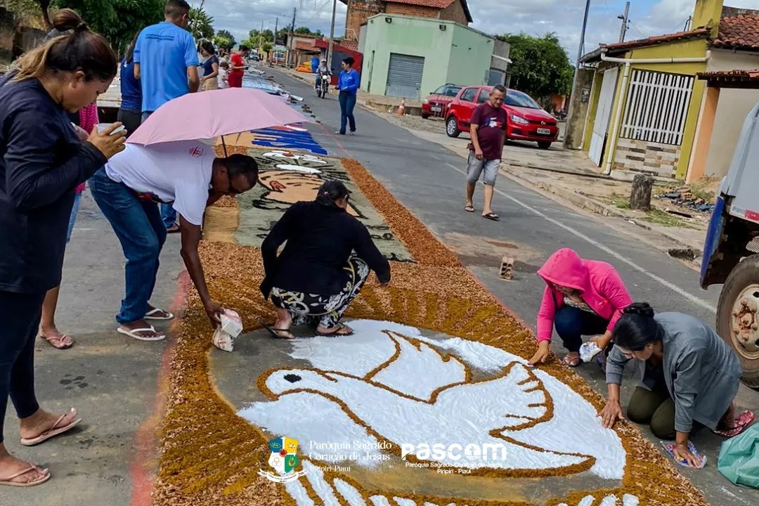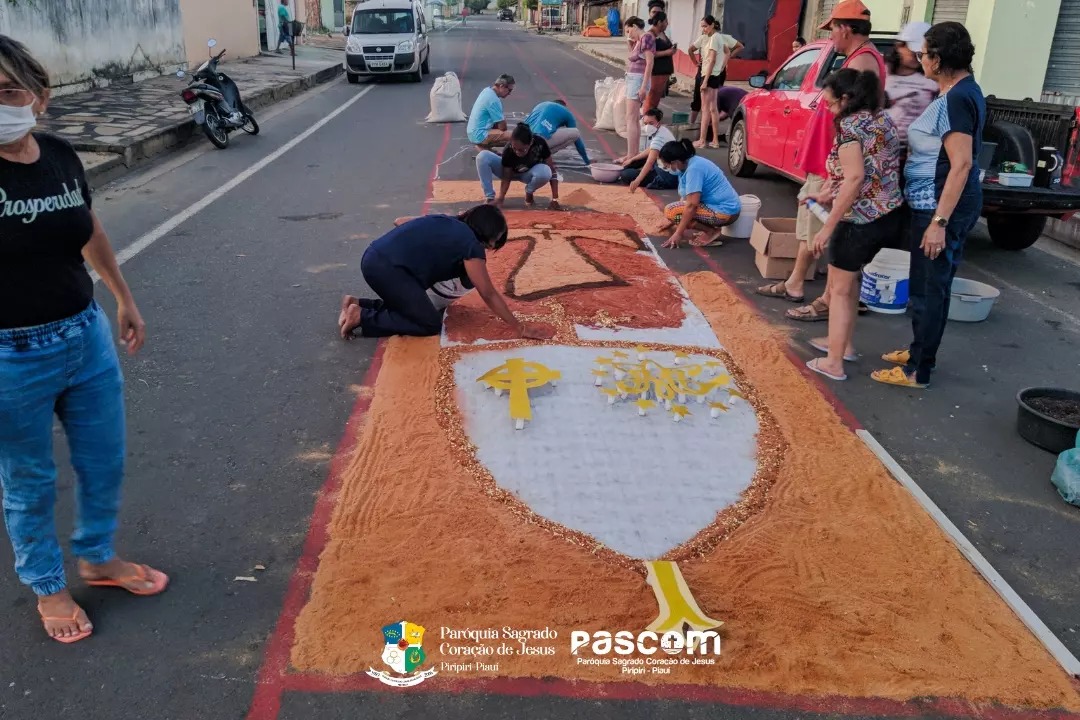 Milhares de fiéis participaram da procissão que teve em seu percurso lindos tapetes confeccionados pelas pastorais e escolas com ajuda dos estudantes, professores, e outras entidades da cidade.