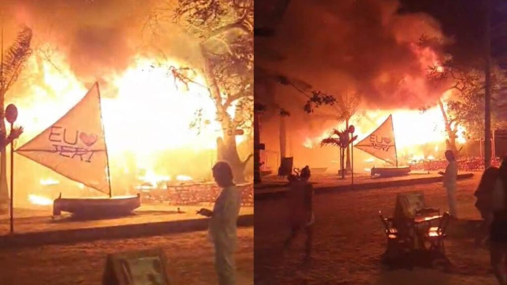 Um restaurante na vila de Jericoacoara, no litoral do Ceará, foi atingido por um forte incêndio na noite desta sexta-feira (15). Imagens mostram a força das chamas e a fumaça no estabelecimento SambaRock, que fica na praça principal.