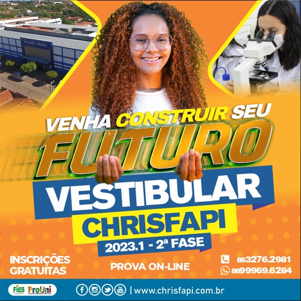 Informações: www.chrisfapi.com.br / na sede da Chrisfapi – Rua Acelino Resende, 132, bairro Fonte dos Matos (PIRIPIRI-PI).Telefones: (86) 3276-2981 ou 99964-6284 ( TIM/WHATSAPP).