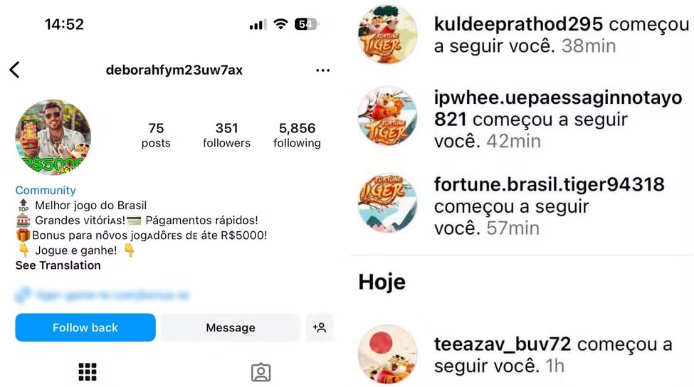 Perfis suspeito no Instagram que promovem o jogo do tigrinho — Foto: Reprodução/Instagram