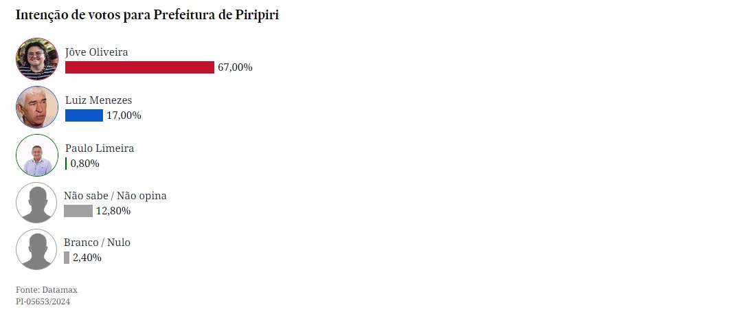 A menos de uma semana para a eleição municipal, o Instituto Datamax divulgou nova pesquisa de intenção de votos para a Prefeitura de Piripiri. Os números divulgados mostram que a atual prefeita Jôve Oliveira (PT), candidata à reeleição, tem uma margem confortável sobre o seu principal opositor, o candidato Luiz Menezes (PSD).