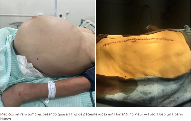Dois tumores pesando quase 11 quilos foram retirados de uma paciente idosa no Hospital Tibério Nunes, em Floriano, nesse sábado (18). De acordo com uma publicação do hospital, a paciente passa bem.
