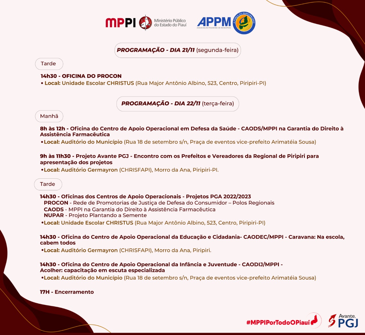 No dia 22 de novembro, a partir das 9h, acontece o “Avante PGJ”, projeto que integra o programa “MPPI Por Todo O Piauí”. A ação consiste na apresentação das iniciativas que compõem o PGA a prefeitos dos municípios da regional Piripiri. O encontro ocorrerá no auditório Germayron (Chrisfapi), Morro da Ana.